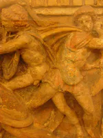 Esta urna (siglos IV–I a. C.) muestra guerreros en un combate inspirado en mitos, cuyos gestos y musculatura evocan modelos griegos pero están representados en un estilo claramente etrusco. Restos de pigmento revelan su superficie antaño viva. El arte funerario como este vinculaba al difunto con la tradición heroica y expresaba creencias sobre la identidad más allá de la muerte.