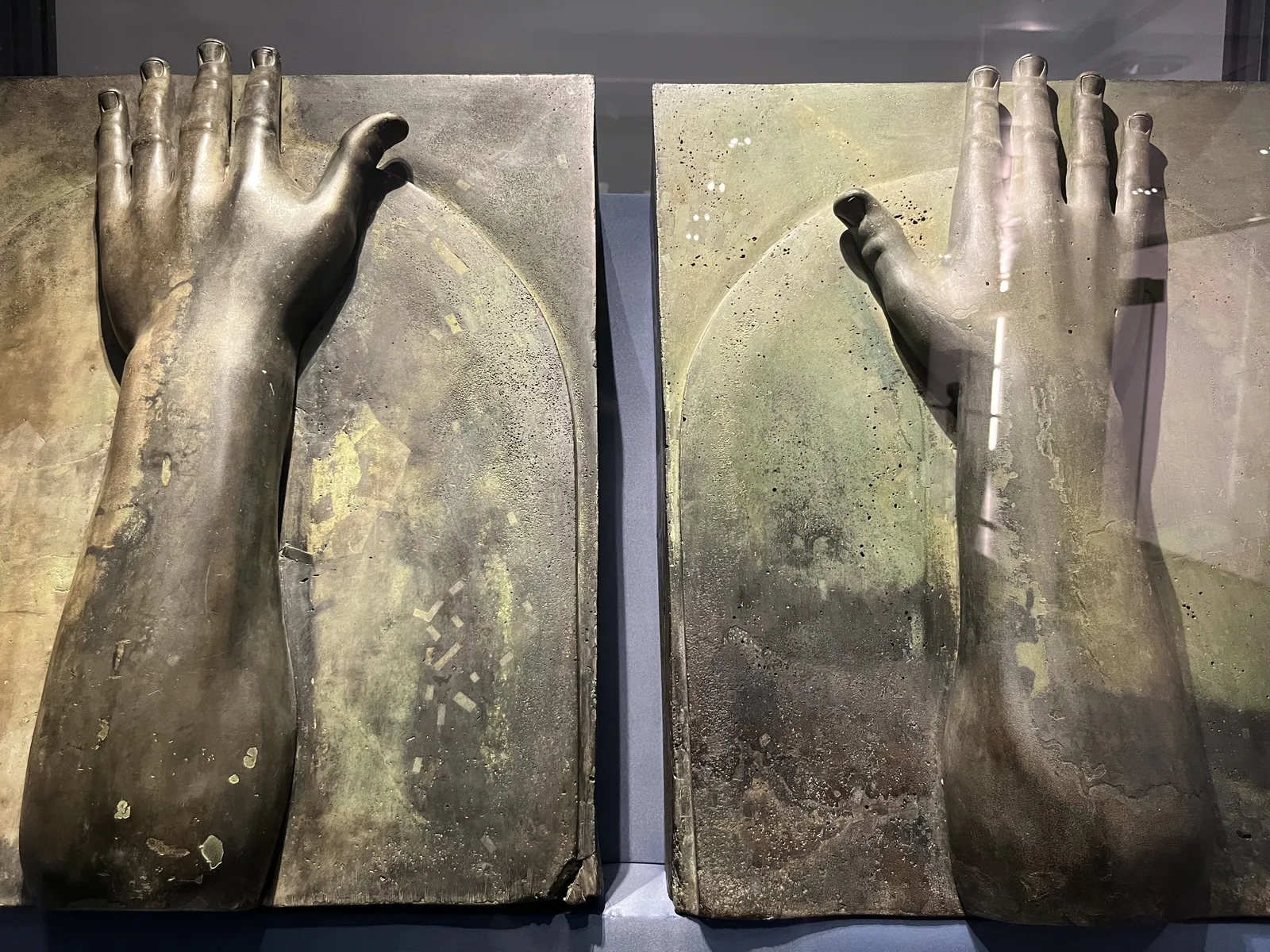 These forearms with open hands adorned a ship from Caligula’s reign (37–41 AD). Crafted with burin and chisel, they were symmetrically placed in pairs, each side featuring a left and a right hand. Positioned horizontally with palms angled and thumbs up, they served an apotropaic function, warding off evil and symbolically protecting the vessel. This reflects the Roman belief in symbols ensuring safety and fortune.